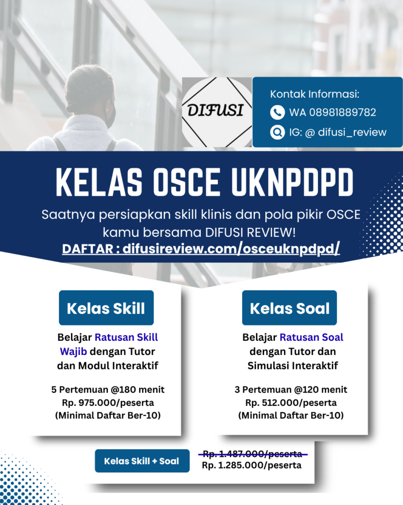 Saatnya persiapkan skill klinis dan pola pikir OSCE kamu bersama DIFUSI REVIEW! OSCE menuntut kita untuk bisa berpikir cepat, sistematis, terstruktur, percaya diri, dan tentu saja terampil secara klinis. Sering kali yang bikin gagal bukan karena “tidak tahu penyakitnya”, tapi karena: